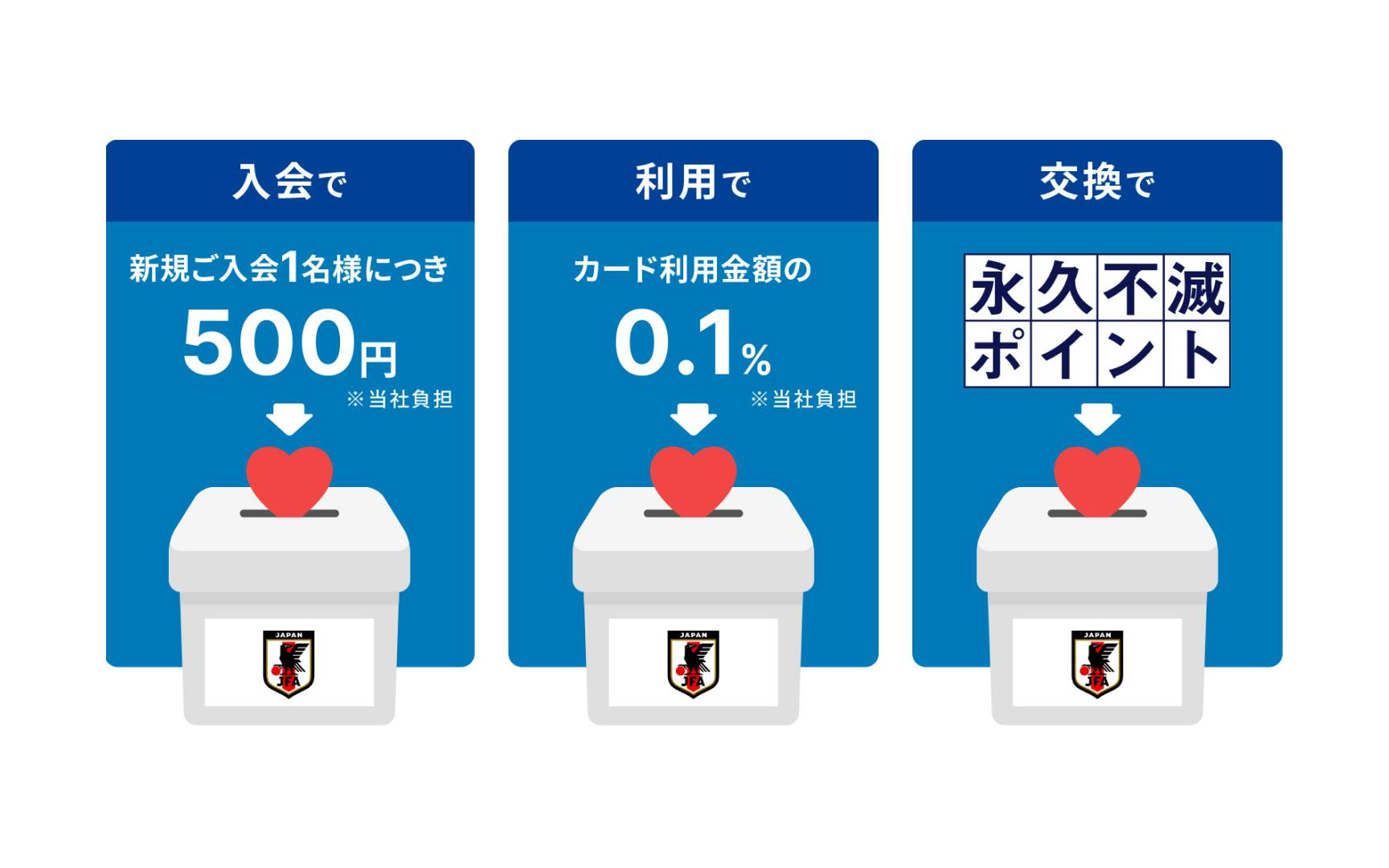 ご利用額の0.1%が日本代表の強化資金として寄付されます。また、入会時にも1名様につき500円をクレディセゾンから寄付。会員様による永久不滅ポイント交換による寄付も実施いただけます。