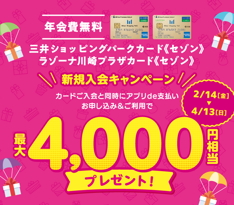 キャンペーン期間中、三井ショッピングパークカード《セゾン》、ラゾーナ川崎プラザカード《セゾン》に