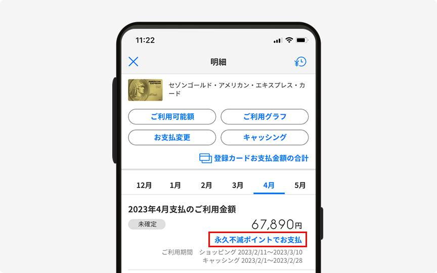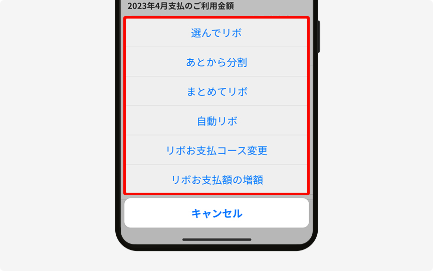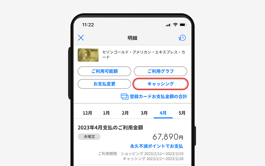 ホーム画面の「お支払金額」「ご利用金額」¥マークの「明細」をタップすると「明細」画面を表示できます。ご利用明細・ご利用可能額・お支払変更・ご利用グラフなどをはじめ、明細に関する機能を搭載しています。